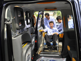 5月15日,北京首汽出租車公司服務(wù)于奧運會的首批無障礙出租車達(dá)到,并將于5月20日開始上路行駛。圖為工作人員展示將殘疾人乘客的輪椅推上奧斯汀出租車的過程。