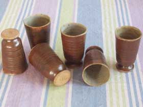 那天,我又逛到了那個基督教二手店,一下子就在一堆器皿中發(fā)現(xiàn)了幾個樣式奇特的小杯子。它們的外表是深褐色的,有很明顯的一圈一圈的紋路,拿在手上感覺一點也不滑手。杯子的里面是雞蛋清色,還有麻麻點點的點綴。最有特點的是它們的形狀和底座,瘦長條型的,和一般的西洋杯子的形狀不一樣。尤其是底座,有特意加強的效果,使杯子的重心下移,雖然細(xì)長但很穩(wěn)當(dāng)。這樣纖細(xì)修長的杯子顯然是東方風(fēng)格的,只有東方人的縝密才能構(gòu)思出這樣的粗中有細(xì)的作品來。在每個杯子的底座下,還有一個方形的印章,看不清是什么字,但很顯然,它們曾經(jīng)是作者的珍愛。