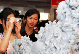 11月19日,為期三天的2006中國(四會)翡翠博覽會在“中國玉器之鄉(xiāng)”——廣東省四會市閉幕。該博覽會吸引了來自東南亞、歐美、中國港澳臺地區(qū)的3000多家客商參會。博覽會還舉辦了翡翠玉器展銷和拍賣、玉器精品評選和玉飾品高峰論壇等活動。圖為展會現(xiàn)場一尊價值逾千萬元的玉器工藝品。