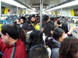 8日晚18時,是下班乘車高峰時段,乘客在北京地鐵乘車擁擠不堪情景。