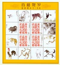 近百位著名畫家繪制的近百幅金豬“百態(tài)圖”及著名畫家郭利杰特為本珍藏冊(cè)精心創(chuàng)作的國畫“百豬圖”,被制成十版80枚生肖郵票、十版《百豬賀歲》國畫小全張。