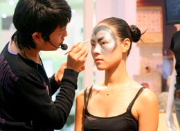 1月31日,一位化妝師在展會現(xiàn)場進行流行彩妝展示。當(dāng)日,2007上海美容展在上海新國際博覽中心開幕,來自23個國家和地區(qū)的300多家廠商參展。
