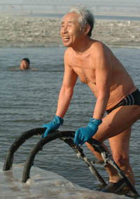 佳木斯冬泳隊(duì)最年長79歲的佟德本老人在作冬泳鍛煉。