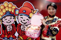 圖為一位工作人員在展示特色鮮明的婚禮點(diǎn)心盒,據(jù)悉新式結(jié)婚用品近期頗受歡迎。