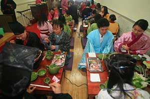 餐廳內(nèi)伸手不見五指,摸著坐、摸著吃,無論是白天還是夜晚,只要消費者走入這種“黑暗餐廳”,就只能依靠觸覺、嗅覺、味覺去完成一場另類的“夜宴”。起源于瑞士的首家“黑暗餐廳”,誕生于1999年,發(fā)明者本意是為盲人提供就業(yè)機會,沒想到卻在數(shù)年之內(nèi)風行全世界。目前,北京、上海等城市都已有“黑暗餐廳”落腳,長春首家“黑暗餐廳”也將于本月底開業(yè)——據(jù)這里的經(jīng)理呂泰山介紹:“消費者乍一進來會不習慣,但一旦適應了就會產(chǎn)生一種接近于心無旁騖的放松! 在長春的一家“監(jiān)獄酒吧”內(nèi),包房均為“牢房”,鐵窗、鐵鎖、鐵鏈、鐵桌、鐵凳一應俱全,墻上煞有介事地刻有“犯人”懺悔的文字,“牢門”外的服務生穿著保安制服進行“把守”;璋档墓饩下,消費者如“囚犯”般置身其中。正在喝酒的曾小姐表示,自己平時常泡吧,但是在“監(jiān)獄”中泡吧還是第一次。“感覺挺新奇的,就是圖個刺激。”她說。 “好的,明天中午12時為您預留包房。大俠,后會有期!”——這是記者通過電話在長春一家“武俠酒店”訂餐后收到的答復。次日,記者來到這家酒店的時候,頓感自己如同置身金庸、古龍的武俠世界一般:服務員均為店小二打扮,包房名稱為“明教”“華山派”等武林門派,筷子叫“雙截棍”,湯匙叫“小李飛刀”,結(jié)賬稱為“收銀子”……據(jù)悉,“武俠酒店”在合肥、南京、廣州等地的分店生意也異;鸨。 在各種各樣的“另類餐廳”中,人們不僅品嘗著美食,更從中體驗到了不用以往的餐廳文化。