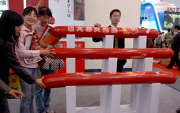 4月27日,幾位參觀者在好奇的觀看幾根超大火腿腸。正在河南鄭州舉辦的第二屆中國中部投資貿易博覽會上,一家食品加工企業(yè)特別制作了三根各重50公斤、長兩米的超級火腿腸在現(xiàn)場展示,吸引參觀者。