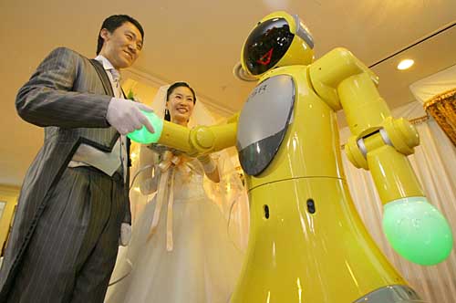 日前,在韓國中部城市大田,新郎錫先生(左,音譯)同自己設計的機器人司儀泰羅握手。在韓國一機器人制造公司擔任設計師的錫先生當天舉行婚禮,“邀請”自己參與設計的機器人泰羅擔任婚禮司儀。據(jù)介紹,這是世界上首次由機器人擔當婚禮司儀;槎Y后泰羅將被升級改造,用作他途。泰羅造價約為21.5萬美元。