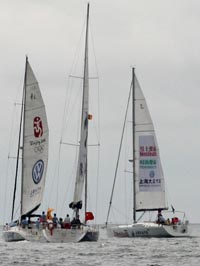 7月11日,參加“共迎奧運 體驗帆船”活動的三艘帆船揚帆駛向大海。當日是“航海日”,“共迎奧運、體驗帆船”活動在大連星海灣游艇港起航,15名志愿者分乘三艘帆船揚帆駛向青島奧帆基地。
