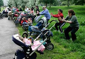 據(jù)美國洛杉磯媒體報道,北美不少新媽媽在參加“手推車快步走”活動,她們一起帶著寶寶適當(dāng)運動,據(jù)說這對恢復(fù)身材、樹立信心非常有效。 當(dāng)新生命降臨的喜悅和熱鬧過后,很多初為人母的女性不得不面對身材走樣、與社會聯(lián)系減少等煩惱。洛杉磯新近出現(xiàn)的“手推車快步走”培訓(xùn)班正是為了鼓勵新媽媽帶著寶寶走出家門,恢復(fù)美好身材,告別沮喪心情。 據(jù)報道,美國和加拿大已有184家這樣的培訓(xùn)班,學(xué)員超過兩萬名。參加培訓(xùn)班每個月的費用在50美元到75美元之間。新媽媽每次運動一個小時左右,最后用5到10分鐘放松,運動結(jié)束后還可以相約一起購物或聊天。 31歲的喬治婭·米切爾是培訓(xùn)班的教練。她說,六周大的寶寶就可以陪著媽媽訓(xùn)練,媽媽們可根據(jù)自己的情況選擇不同等級的課程,所有教練都是有專業(yè)資格認(rèn)證的年輕媽媽。 通常,新媽媽們不愿意為了健身而把孩子交給保姆,“手推車快步走”正好可以讓媽媽帶著寶寶鍛煉。因為經(jīng)歷相似、年齡相仿,年輕媽媽們在一起會非常開心,很多產(chǎn)后在家里悶出抑郁癥的媽媽們因此得到了釋放。而且,媽媽運動的時候和寶寶有很多互動,小家伙們往往很興奮,不會產(chǎn)生被遺忘、被忽略的感覺。