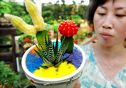 一位女士正在觀看一款鋪墊著彩砂的盆栽。近日,銀川花市上出現(xiàn)了一種鋪墊著彩色砂土和石子的盆栽植物,艷麗的彩色砂石為原本單調(diào)的綠色觀葉植物增添了別樣色彩。