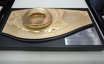 以北京奧運會主體育場——國家體育場為造型的奧運特許商品“鳥巢”金屬模型,9月19日起在北京、上海、廣州、沈陽、青島等12個城市的16家奧運特許商品專賣店同步上市。 據(jù)北京奧組委相關(guān)人士介紹,“鳥巢”金屬模型是把國家體育場按照標(biāo)準(zhǔn)尺寸等比例縮小。該金屬模型包括了“鳥巢”及周圍地形、水系、訓(xùn)練場等,將“鳥巢”空間結(jié)構(gòu)和細節(jié)——如鋼架結(jié)構(gòu)、入口、臺階、看臺、賽場等的位置和形象非常精準(zhǔn)地表達出來。 模型有鍍金和鍍古錫兩種顏色,分為大、中、小三種型號,價格從900多元到4000多元不等,其中大、中兩種型號限量發(fā)行。特別具有收藏意義的是,大、中號產(chǎn)品的金屬標(biāo)牌均由建筑“鳥巢”的剩余鋼材制成。 |