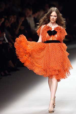在法國(guó)首都巴黎舉行的2008年春夏時(shí)裝展上,一名模特在展示索尼亞·里基爾的時(shí)裝作品。