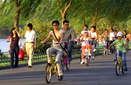 游客騎車游覽杭州西湖白堤景區(qū)。不久,游客就可坐黃包車,賞西湖景。本報(bào)記者:徐昱