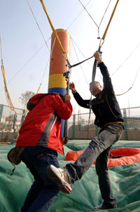 11月9日,一名游客準備在位于青海省西寧市寧湖湖畔的寧湖民族體育文化旅游園內(nèi)玩蹦極。