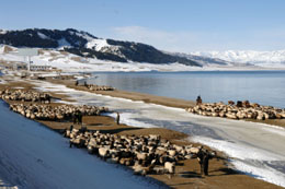 賽里木湖位于新疆北部伊犁博爾塔拉,是新疆新興的重要旅游景點。到了冬季,深藍色的湖水、白色的雪山和牛、羊、駱駝等組成一幅壯麗畫卷。