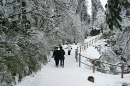 雪不是峨眉山獨(dú)有,但是記者采訪中遇到的不少?gòu)V東人、福建人都是沖著峨眉山的雪而來(lái)。 北方的雪太大,來(lái)得也生猛,一下子將大地整個(gè)兒罩住了。視野內(nèi)白茫茫的一片,缺少了幾分婉約和靈動(dòng)。而南方的雪斯斯文文地飄落,似乎是藏在深閨里的姑娘,尋不見她的蹤影。峨眉山“柔美白雪壓綠樹,剔透冰晶裹紅花”的冰雪奇景,讓北方游客贊嘆。 冰花樹掛、雪凇霧凇,呈現(xiàn)氣勢(shì)磅礴的雪域壯景。在海拔2000米以上,峨眉山已是瓊樓玉宇的雪域世界。千樹萬(wàn)樹的冰晶,千巒萬(wàn)嶂的雪嶺,鋪排出一片冰清玉潔的瓊瑤仙境。尤其是登上金頂鳥瞰,浩瀚純凈的白雪,綿綿群山馱著白雪,直延伸至天際,演變成冰海凍浪,這一切勾畫出了“銀色世界”的絕美之姿。 據(jù)介紹,峨眉山最美的雪景是峨眉十景的“大坪雪霽”。大坪觀雪和金頂大不一樣。金頂觀雪是站在高峰之巔,遙望“岷山千里雪”;而大坪觀雪則是站在群峰環(huán)合的孤峰平臺(tái)之上,環(huán)顧四壁玉峰素裹,更絕的是冰雪林中有時(shí)還散發(fā)出幽蘭和野梅的香氣,偶爾能看到鮮紅的木芙蓉傲雪而放。 除了觀雪景,峨眉山最大的樂(lè)趣還在于滑雪。峨眉山滑雪場(chǎng)在海拔2300米的雷洞坪停車場(chǎng)公路右側(cè),占地15畝,冬季平均氣溫-5°C,積雪期為四個(gè)月。元旦前夕,峨眉山雷洞坪滑雪場(chǎng)的氣溫降到了零下3攝氏度以下,早晚氣溫更低至零下5攝氏度。此外,這里以原始森林為主要的森林覆蓋率達(dá)到95%,自然風(fēng)光旖旎,林區(qū)間分布有多種類型植被。獨(dú)特的氣候條件,加之該處地段角度平緩開闊,為滑雪提供了得天獨(dú)厚的氣候與地形條件。在這里,您可以縱情地打雪仗、堆雪人,乘狗拉雪橇,駕雪地飛碟在滑道中一瀉而下直沖300多米的坡底。還可以踏著滑雪板穿行在森林中,體驗(yàn)激情四溢的高山滑雪。