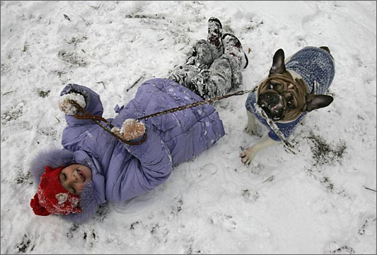 在烏克蘭首都基輔,一個(gè)小女孩騎著她的寵物狗在白雪覆蓋的公園里盡情玩耍。新華社/路透
