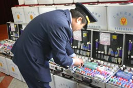 8日,記者從黑龍江工商系統(tǒng)食品安全快速檢測(cè)箱啟動(dòng)儀式上獲悉,為了確保百姓吃上放心食品,讓假冒偽劣和違規(guī)食品添加劑無處遁形,黑龍江投入大量資金為基層工商所配備食品安全快速檢測(cè)箱。該設(shè)備的投入使用,將有效防止假冒偽劣食品流入市場(chǎng),為百姓營造安全放心的食品消費(fèi)環(huán)境。圖為黑龍江一位基層工商所的工作人員在查看快速檢測(cè)箱的化學(xué)試劑。