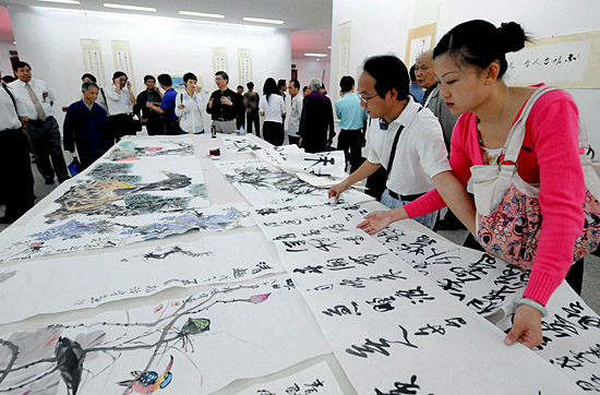 5月16日,觀眾在“兩馬”書畫攝影作品展上欣賞書畫作品。當日,福州馬尾和馬祖聯(lián)合舉辦的“兩馬”藝術(shù)家書畫和攝影作品聯(lián)展在福州畫院舉行,展出的“兩馬”藝術(shù)家數(shù)百幅書畫攝影作品吸引了眾多觀眾。