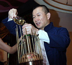 譚盾在《茶》開票儀式上介紹水琴。(資料照片) | 本報訊