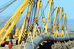8臺吊管機正在將直徑1.2米的天然氣管道緩緩沉入3米多深的管溝中。在新疆博樂境內的天山腳下,國家重點建設工程西氣東輸二線的建設者們正頭頂烈日緊張施工。西氣東輸二線工程于2008年2月22日開工建設,全長9139公里,途經(jīng)我國14個省區(qū)市。年輸氣量300億立方米,穩(wěn)定供氣30年以上,是我國首次引進境外天然氣資源、具有戰(zhàn)略意義的特大型天然氣管道建設項目。