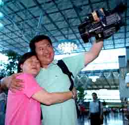 7月13日,臺(tái)灣導(dǎo)游潘女士(左)和大陸游客在臺(tái)北桃園機(jī)場(chǎng)惜別。當(dāng)日,大陸居民赴臺(tái)旅游首發(fā)團(tuán)結(jié)束歷史之旅。大陸居民赴臺(tái)旅游首發(fā)團(tuán)的680名游客自7月4日開(kāi)始在臺(tái)的旅程,沿途均受到了臺(tái)灣同胞的熱情歡迎和接待。幾天來(lái),大陸游客們先后游覽了日月潭、阿里山、墾丁、太魯閣、臺(tái)北故宮博物院等知名景點(diǎn)。 |