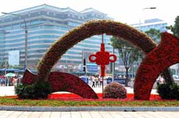 安放在西單附近的一座立體花壇雕塑《中國結(jié)》。隨著奧運會開幕日期的臨近,北京市長安街的道路兩旁陸續(xù)增添了許多造型獨特、寓意深刻的花壇雕塑,姹紫嫣紅的鮮花把這條“首都第一景觀大道”裝點得格外誘人、靚麗。