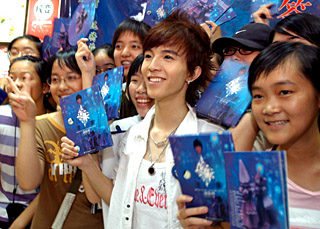 | “80后”作家郭敬明(前排中)攜其首部音樂小說《迷藏》亮相溫州書城,引來數(shù)百名青少年讀者追捧。資料照片 |