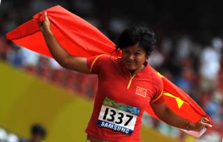 9月8日,中國(guó)選手姚娟在比賽后身披國(guó)旗慶祝勝利。當(dāng)日,北京2008年殘奧會(huì)田徑比賽在國(guó)家體育場(chǎng)“鳥(niǎo)巢”開(kāi)賽,姚娟以40米51的成績(jī)打破女子標(biāo)槍F42-46級(jí)世界紀(jì)錄,并獲得冠軍。
