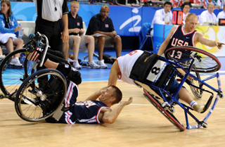 輪椅籃球隊(duì)員摔倒后又奮力起身繼續(xù)投入比賽的那一刻,他們的拼搏精神都會(huì)贏得觀眾經(jīng)久不息的掌聲。新華社記者:李紫恒 攝