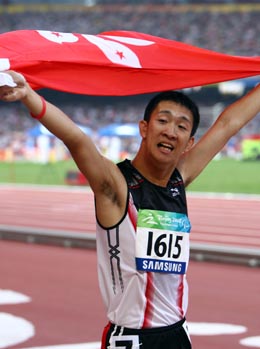 9月15日,中國(guó)香港選手蘇樺偉在比賽后慶祝勝利。當(dāng)日,在國(guó)家體育場(chǎng)進(jìn)行的北京2008年殘奧會(huì)男子200米T36級(jí)決賽中,蘇樺偉以24秒65的成績(jī)奪冠,并打破世界紀(jì)錄。