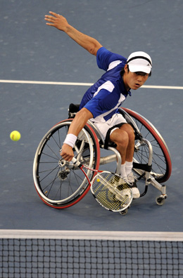 9月15日,日本選手國(guó)枝慎吾在比賽中回球。當(dāng)日,在北京2008年殘奧會(huì)輪椅網(wǎng)球男子單打公開級(jí)決賽中,國(guó)枝慎吾以2比0戰(zhàn)勝荷蘭選手羅賓·阿梅爾蘭,奪得冠軍。