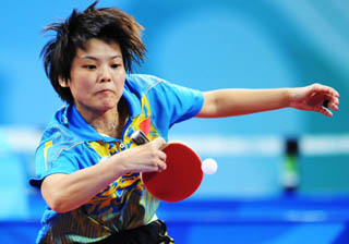 9月15日,中國(guó)選手范蕾在比賽中回球。當(dāng)日,在北京2008年殘奧會(huì)乒乓球女子團(tuán)體F6-10金牌爭(zhēng)奪賽中,中國(guó)隊(duì)以3比1戰(zhàn)勝波蘭隊(duì),奪得冠軍。