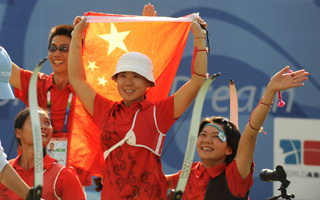 9月15日,中國(guó)選手高芳霞(中)、符洪芝(左一)、蕭彥紅(右一)慶祝勝利。當(dāng)日,在北京2008年殘奧會(huì)女子團(tuán)體反曲弓-公開級(jí)決賽中,中國(guó)隊(duì)?wèi)?zhàn)勝韓國(guó)隊(duì),獲得金牌。