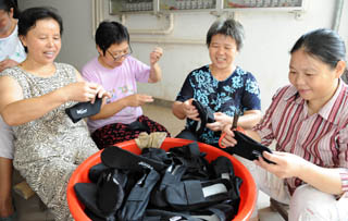 江西贛州市章貢區(qū)渡口路社區(qū)是贛州市集中安置老弱特困殘人員的首個廉租房社區(qū)。2007年來,社區(qū)以“解決就業(yè)與再就業(yè)、扶貧幫困”為宗旨,創(chuàng)辦了社區(qū)“和諧創(chuàng)業(yè)社”,從生產廠家以訂單形式接回串燈泡、打火機組裝、信封加工、組裝電子元件以及鞝鞋底等十幾個手工制作項目,讓社區(qū)居民足不出戶實現(xiàn)就業(yè)。9月19日,渡口路社區(qū)困難戶龔冬英(右一)等在樓道口鞝鞋底。 |