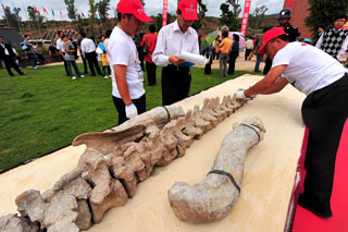 10月9日,在祿豐世界恐龍谷,工作人員在拆卸恐龍化石。 云南省人民政府向香港特別行政區(qū)政府贈(zèng)送的恐龍“阿納云香”化石在云南省楚雄彝族自治州祿豐縣祿豐世界恐龍谷裝箱啟程赴港。當(dāng)日在恐龍出土地祿豐世界恐龍谷舉行了化石啟運(yùn)儀式,當(dāng)?shù)匾图胰艘宰盥≈氐亩Y儀歡送恐龍。彝族民間藝人載歌載舞,一具體長7.8米的祿豐龍化石被分段裝箱,鞭炮聲中,“阿納云香”告別故鄉(xiāng)遠(yuǎn)赴香港。