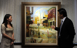 10月20日,佳士得拍賣行的工作人員在介紹畫(huà)家朱沅芷的作品《歡樂(lè)節(jié)慶的百老匯》。 當(dāng)日,香港佳士得拍賣行舉行新聞發(fā)布會(huì),宣布將于11月30日和12月1日舉行中國(guó)20世紀(jì)藝術(shù)和亞洲當(dāng)代藝術(shù)專場(chǎng)拍賣會(huì),500多件拍品總價(jià)值逾4億港元。 |