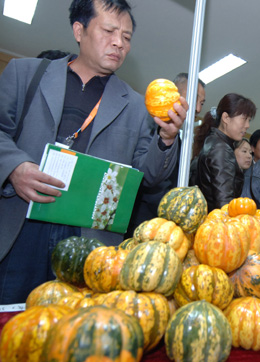 11月5日在陜西楊凌開幕的第十五屆中國楊凌農(nóng)業(yè)高新科技成果博覽會上,新竹市青果商業(yè)同業(yè)公會首次前來參展,帶來了10種產(chǎn)自臺灣的特色水果進(jìn)行展銷。圖為參觀者在新竹市青果商業(yè)同業(yè)公會展臺前觀看產(chǎn)自臺灣的特色南瓜。