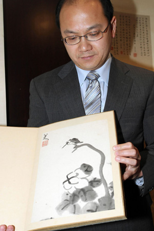 香港佳士得書畫專家展示八大山人《山青水碧鳥語花香》冊頁。新華社記者:張鳳國 攝