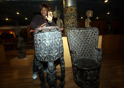 11月24日,由中非文化交流中心和北京橋藝術(shù)中心聯(lián)合主辦的“原始藝術(shù)與現(xiàn)代生活——非洲藝術(shù)精品展”在北京開(kāi)箱布展。圖為一位非洲藝術(shù)家在介紹非洲近200年的巴姆雷克族酋長(zhǎng)王座和非洲酋長(zhǎng)禮器鼓。