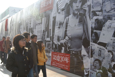 “長安杯”紀(jì)念改革開放30周年全國攝影大展定于12月16日在北京王府井步行街舉行。圖為人們從大展活動(dòng)巨幅宣傳牌前走過。