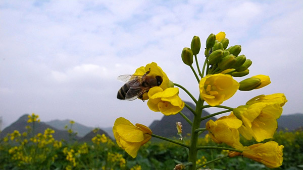 據(jù)悉,2009年中國·云南·羅平國際油菜花文化旅游節(jié)將于1月15日開節(jié),此次油菜花節(jié)的主題為“金色花海、魅力羅平”。圖為在油菜花地里,一只蜜蜂在采蜜。
