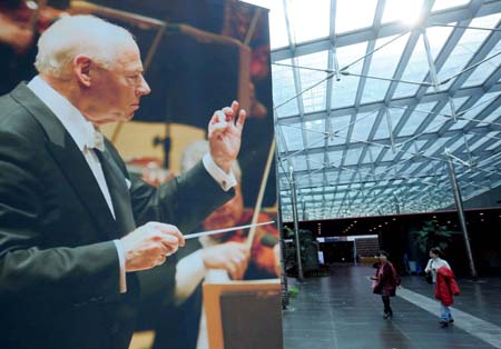 2月13日,觀(guān)眾從國(guó)家大劇院水下走廊懸掛的指揮大師海丁克的招貼畫(huà)旁走過(guò)。13日當(dāng)晚,海丁克和芝加哥交響樂(lè)團(tuán)把80分鐘的馬勒第六交響曲一氣呵成地在國(guó)家大劇院現(xiàn)場(chǎng)演奏。
