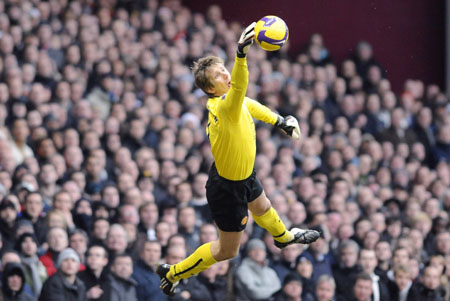 2008/2009賽季英超聯(lián)賽第25輪,曼聯(lián)隊客場以1比0戰(zhàn)勝西漢姆隊。圖為曼聯(lián)隊守門員范德薩在比賽中撲救。