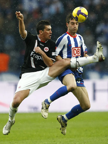 德國足球甲級聯(lián)賽第18輪比賽,柏林赫塔隊球員尼庫(右)與法蘭克福隊球員費寧拼搶。
