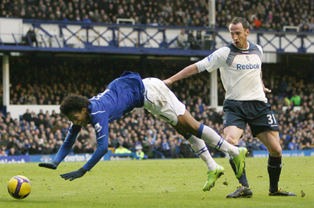 2008/2009賽季英格蘭超級聯(lián)賽第25輪,埃弗頓隊主場3:0完勝博爾頓隊。圖為博爾頓隊球員安·奧布里恩(右)在禁區(qū)對埃弗頓隊新租借球員約(Jo)犯規(guī)。 |