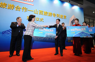 4月6日,北京市旅游局局長(zhǎng)張慧光(前左)向山西太原旅游部門(mén)負(fù)責(zé)人交付北京新地標(biāo)建筑國(guó)家體育場(chǎng)“鳥(niǎo)巢”、國(guó)家游泳中心“水立方”以及國(guó)家大劇院等景點(diǎn)免費(fèi)門(mén)票的大票樣。 當(dāng)日,山西旅游專(zhuān)列抵達(dá)北京,北京市旅游局在北京西客站為620名游客舉行了簡(jiǎn)短而熱烈的歡迎儀式。這是全國(guó)鐵路4月1日零時(shí)起開(kāi)始實(shí)施新的列車(chē)運(yùn)行圖后,旅游區(qū)域合作出現(xiàn)的新舉措。有關(guān)人士認(rèn)為,國(guó)內(nèi)旅游隨著鐵路基礎(chǔ)設(shè)施的逐步完善,正在迎來(lái)“動(dòng)車(chē)時(shí)代”。