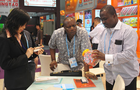 5月5日,尼日利亞客商在廣交會上采購糖果。