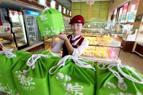 端午節(jié)即將到來(lái),浙江省瑞安市一家食品公司推出一種可重復(fù)利用的無(wú)紡布環(huán)保禮品袋,供人們?cè)谄穱L傳統(tǒng)食品的同時(shí)增添環(huán)保意識(shí)。新華社發(fā)