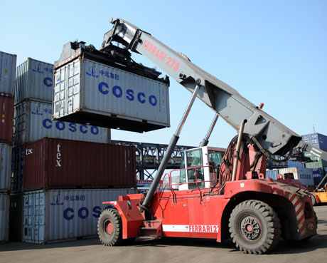 2009年第一季度,廣西欽州港集裝箱吞吐量完成22451標準箱,同比增長33%,其中自2月底開通欽州至香港集裝箱班輪航線后,3月份共完成吞吐量10382標準箱,同比增長56%,單月貨物吞吐量和集裝箱吞吐量均創(chuàng)歷史最高。圖為廣西欽州港勒溝作業(yè)區(qū)工人在儲放集裝箱。